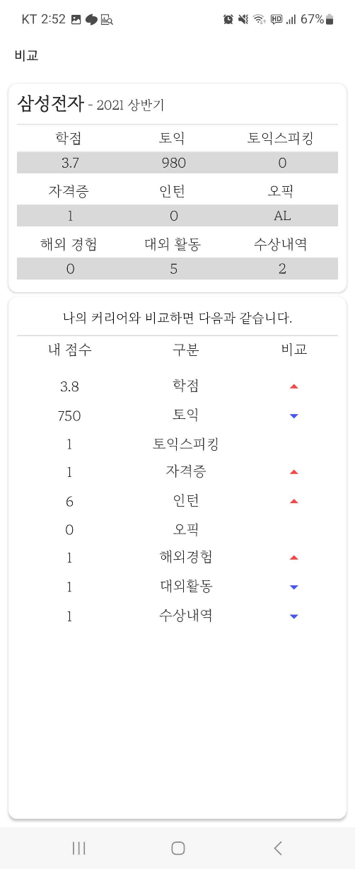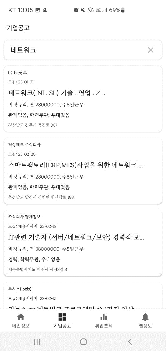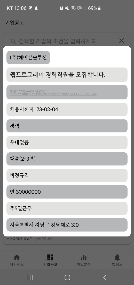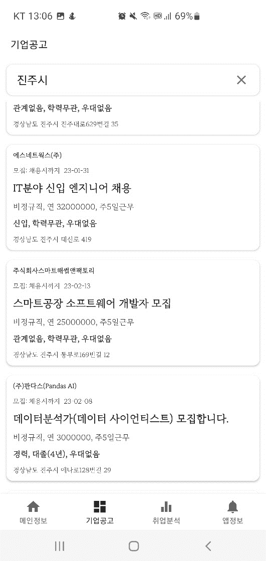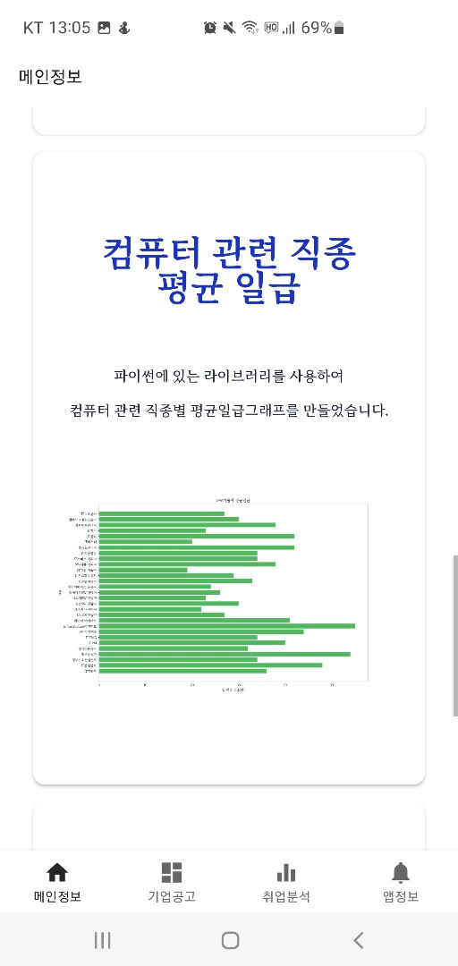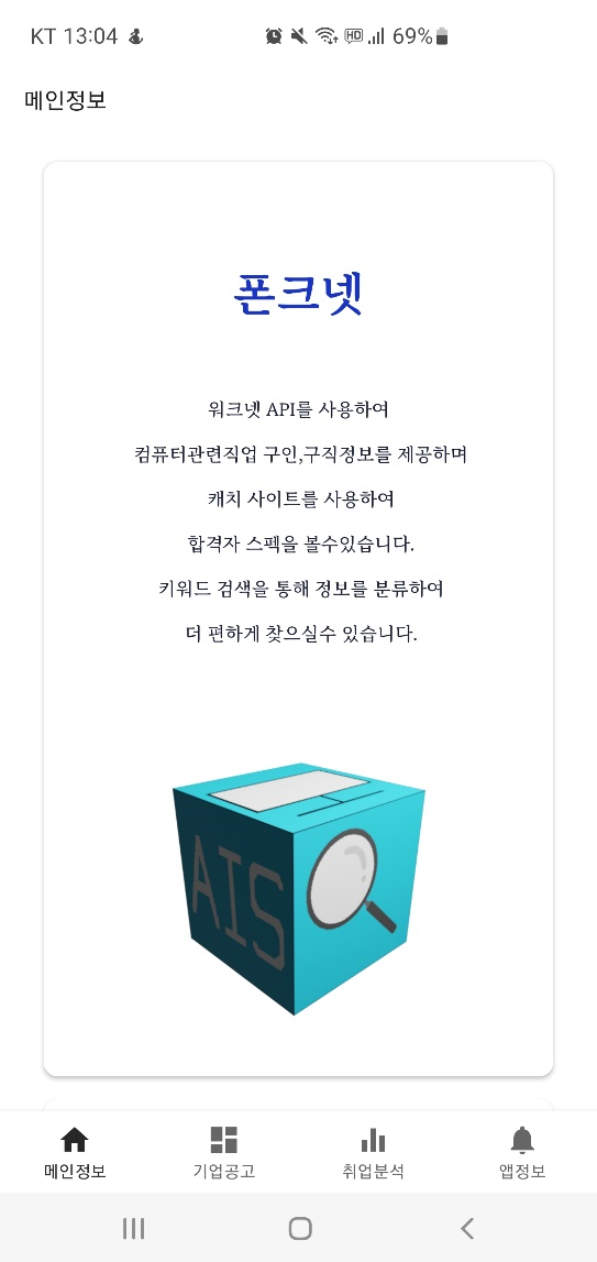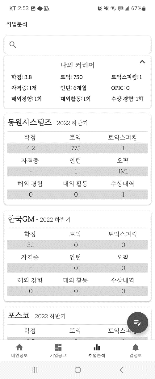 본인은 어플리케이션에서 취업 합격자 스펙 웹크롤링과 , API를 통한 직업 공고 수집을 담당함