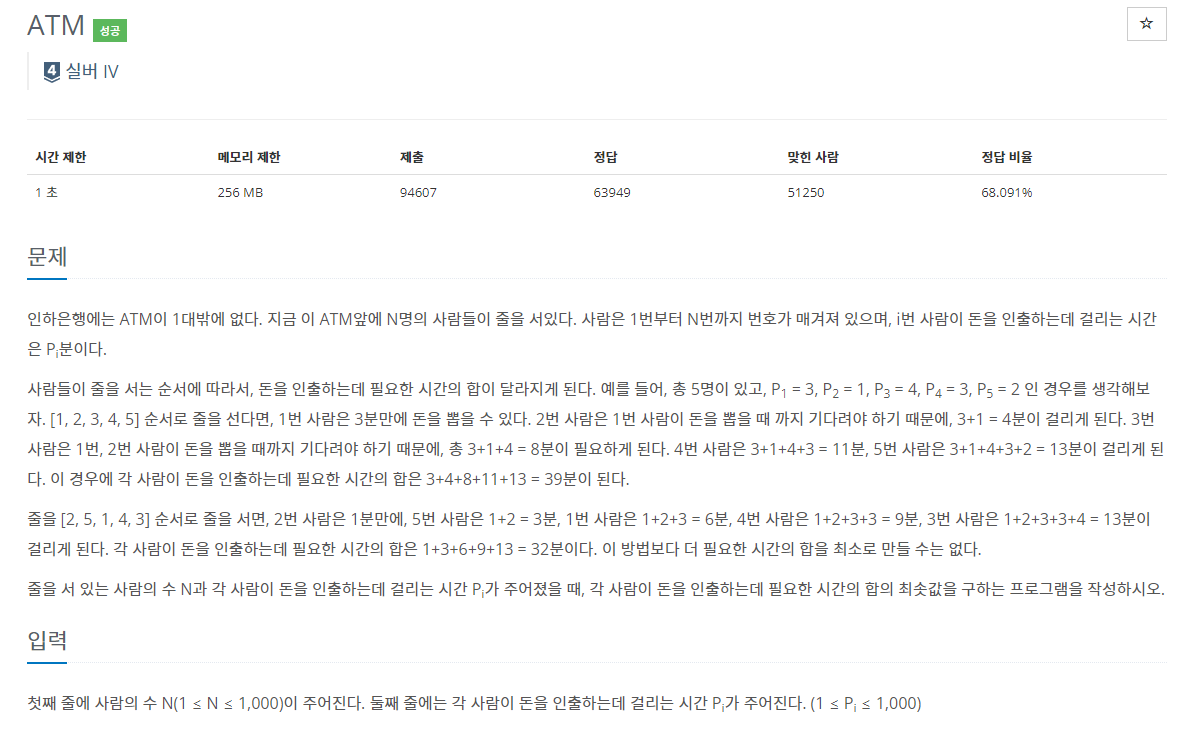 ATM 모든사람의 시간의 합 최소를 구하는 문제이므로