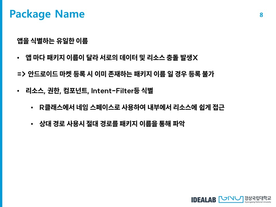 패키지 이름은 리소스, 권한 ,컴포넌트, 인텐트 필터 등을 식별하는데 사용합니다.