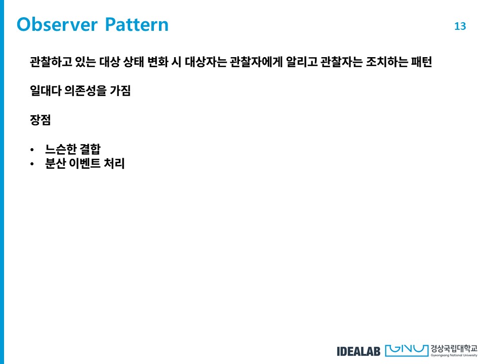 옵저버 패턴은 관찰하고 있는 대상 상태 변화 시 대상자는 관찰자에게 알리고 관찰자는 조치하는 패턴입니다.
