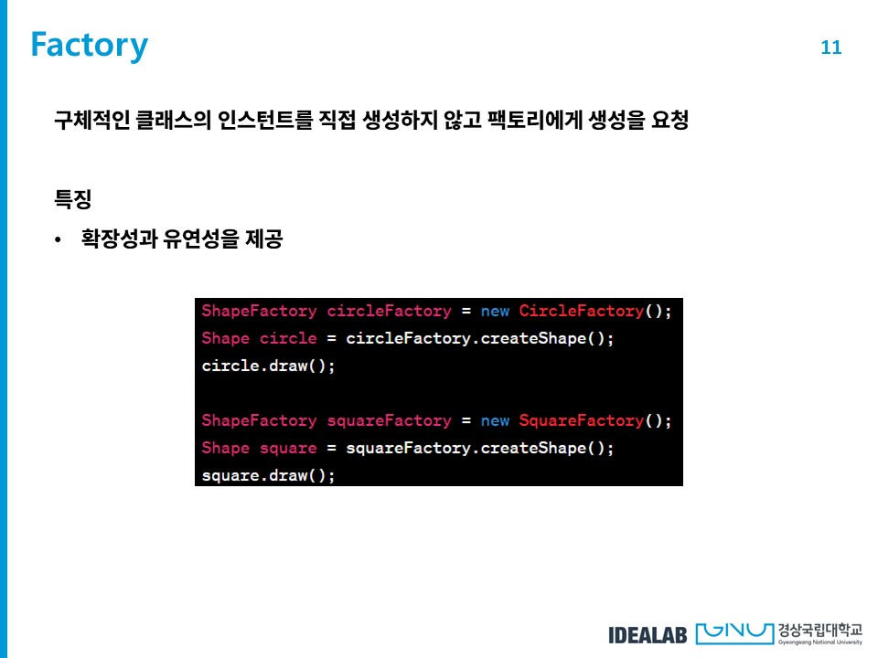 원공장과 사각형 공장은 모양공장 인터페이스를 구현하는 클래스이고 원공장은 원을 찍어내고,