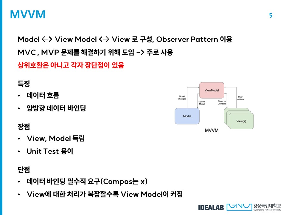 또한 MVC와 MVP 문제를 해결하기 위해 도입되어서 안드로이드 개발 시 주로 사용합니다.