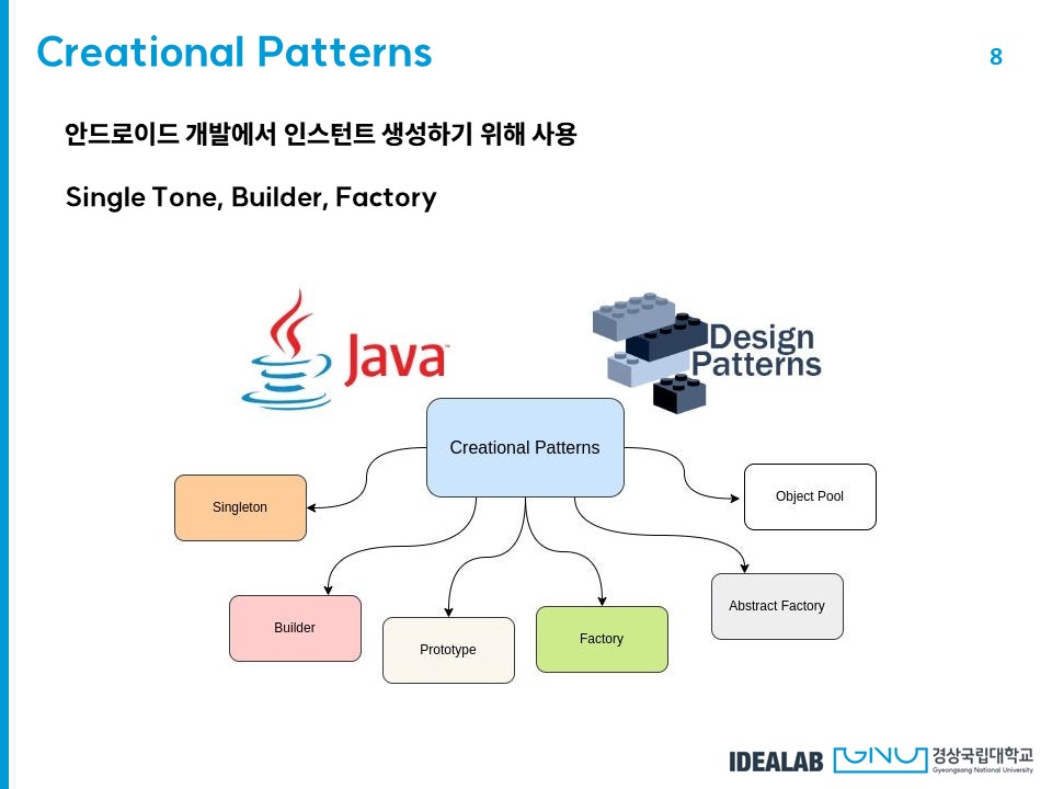 크리에이셔널 패턴들은 안드로이드 개발에서 인스턴트 생성시에 사용합니다.