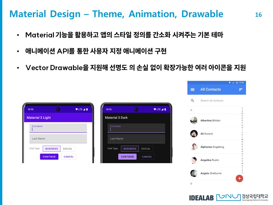 머터리얼 디자인에는 테마, 애니메이션, 드로어블이 있습니다.
