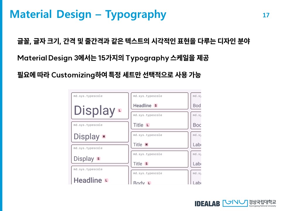 머터리얼 디자인3에서 15가지 타이포 그래피 스케일을 제공하여 원하는 세트를 필요에 따라 사용하면 됩니다.