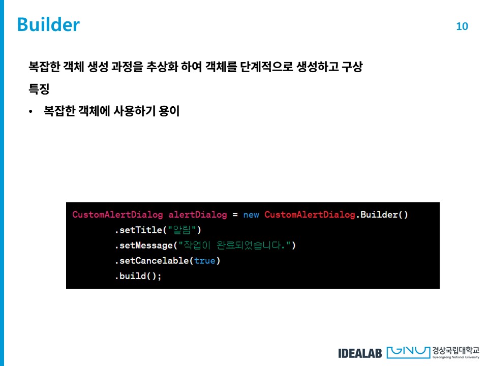 빌더 패턴은 생성자가 많거나 객체의 속성이 다양한 복잡한 객체에 사용하기 좋습니다.