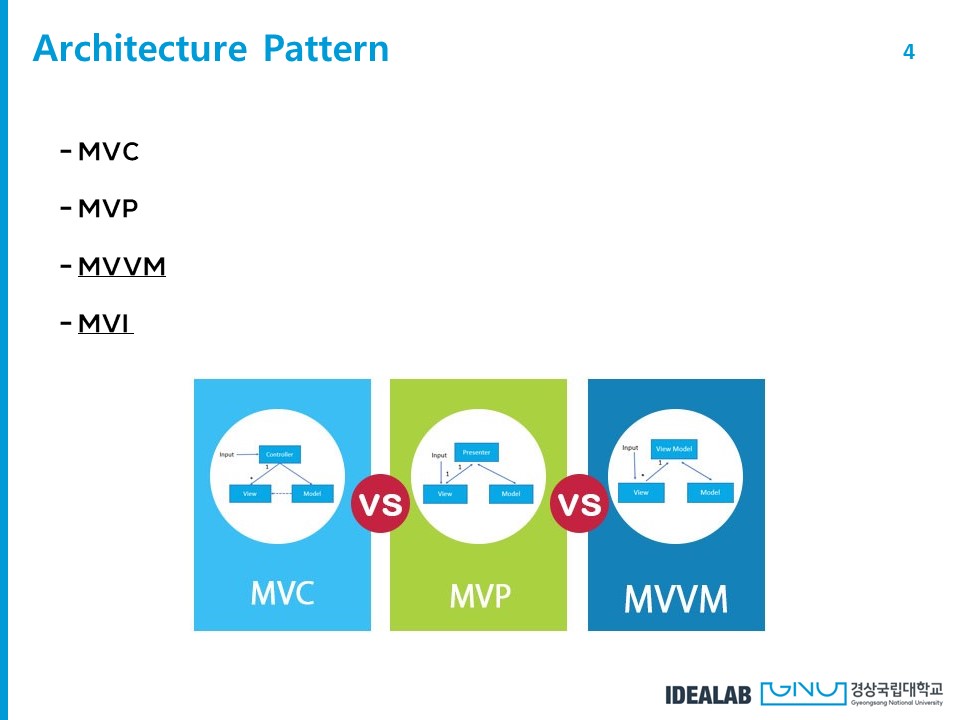 MVC, MVP ,MVVM, MVI 등이 있는데