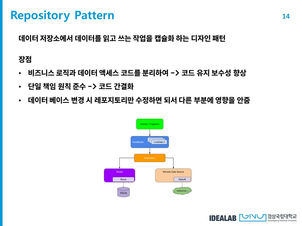 데이터 변경시 레포지토리만수정하면 되서 다른 부분에 영향을 주지 않는 이점이 있습니다.