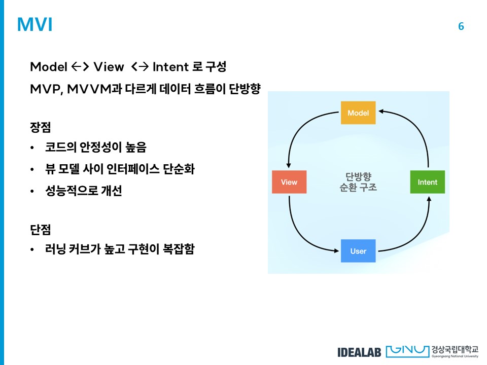 이중에서 MVVM과 MVI가 중요한 것 같아서 좀더 자세히 다뤄보겠습니다.