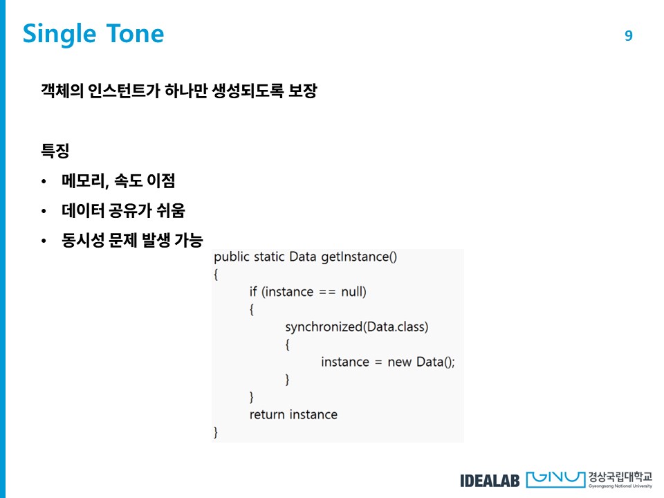 특징으로는 인스턴트를 하나만 생성하게 되니 메모리 낭비 방지를 할 수 있고,