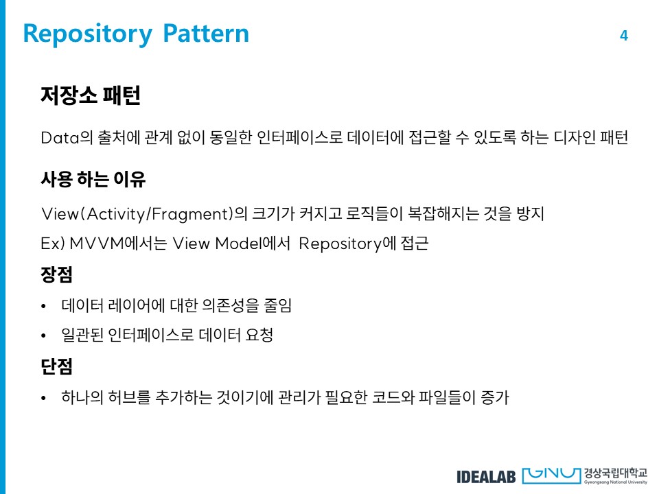저장소 패턴은 View의 크기가 커지고 로직들이 복잡해지는 것을 방지하기 위해 사용합니다.