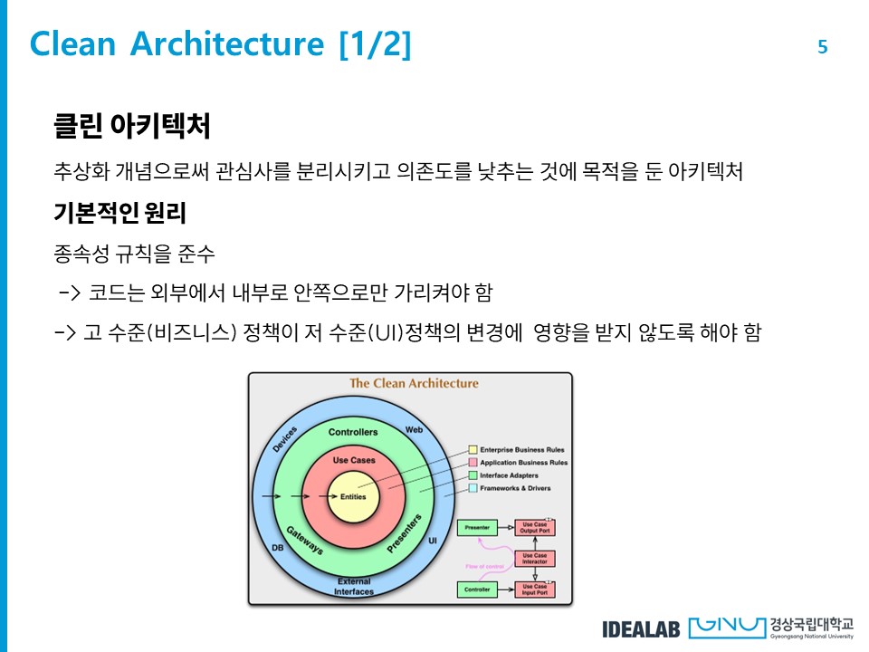 클린 아키텍처는 추상화 개념으로써 관심사를 분리시키고 의존도를 낮추는 것에 목적을 둔 아키텍처 입니다.