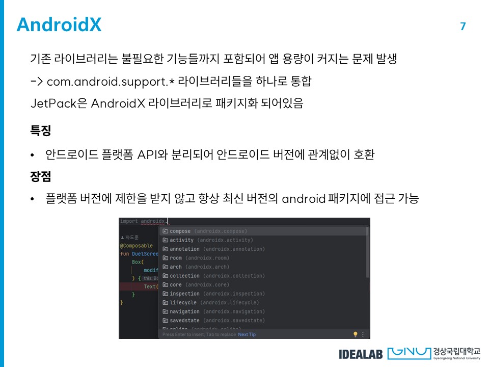 그래서 이 라이브러리들을 하나로 통합한게 AndroidX이고, jetpack은 Android X 라이브러리로 패키지화 되어있습니다.